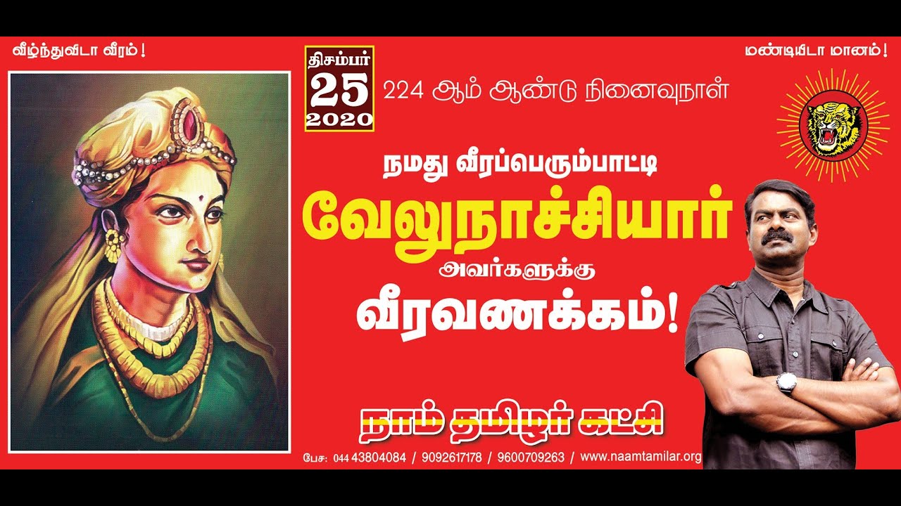 Contact us to Add Your Business அறிவிப்பு: தமிழ்ப் பேரினத்தின் வீரப்பெரும்பாட்டி வேலுநாச்சியாரின் 224ஆம் ஆண்டு நினைவுநாளான இன்று 25-12-2020 காலை 10 மணியளவில் தலைமை அலுவலகம், இராவணன் குடிலில்