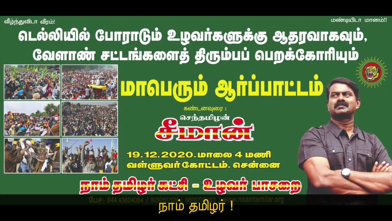 அறிவிப்பு: டிச.19 | வேளாண் சட்டங்களை திரும்பப்பெற வலியுறுத்தி சீமான் தலைமையில் மாபெரும் ஆர்ப் Dec 18, 2020 20 Comments Contact us to Add Your Business — நாம் தமிழர் கட்சி – இது மாற்றத்திற்கான எளிய மக்களின் புரட்சி! கட்சி வளர்ச்சி நிதி வழங்க: Please Subscribe &